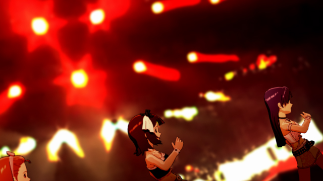 このシーンでは、アイドルたちの透明度をいじって幾分透過させて、背景に馴染ませてます。小さいから透けててもわかんない、だいじょうぶ。